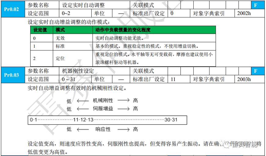 A:当参数Pr0.02为1或2时,直接调整刚性Pr0.03,刚性关联的参数如下表参数: