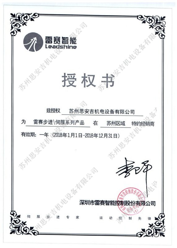 苏州思安吉机电设备有限公司2018年深圳雷赛智能经销授权证书,感谢雷赛智能和广大新老客户的支持、信任与肯定,2018,加油!