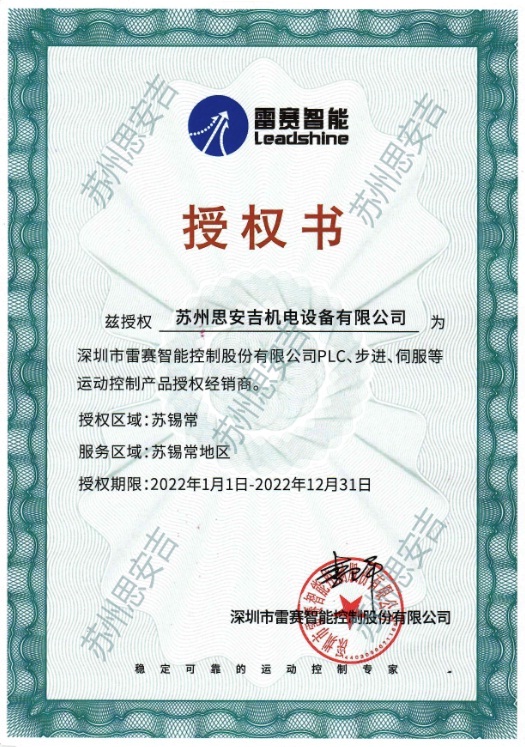 苏州思安吉机电设备有限公司2022年深圳雷赛(雷赛智能和雷赛控制)经销授权证书,感谢雷赛和广大新老客户的支持、信任与肯定!